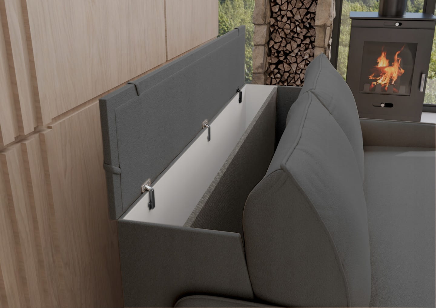 Sofa Selo Hauss została wyposażona w praktyczny pojemnik na pościel umieszczony z tyłu, dzięki czemu jej rozmiar po rozłożeniu pozostaje niezmienny. To doskonałe rozwiązanie dla tych, którzy potrzebują dodatkowej przestrzeni do przechowywania, ale nie chcą rezygnować z estetyki mebla. Sofa z pojemnikiem na pościel pozwala wygodnie przechować kołdrę, poduszki czy koc, bez potrzeby sięgania po dodatkowe skrzynie lub szafki. Wersja ze stelażem włoskim z pojemnikiem doskonale sprawdzi się w niewielkich mieszkaniach, gdzie liczy się każdy centymetr. Dzięki zintegrowanemu materacowi sofa z materacem i pojemnikiem na pościel oferuje wyjątkową łatwość obsługi. Jednocześnie zachowuje spójny, nowoczesny wygląd i nadaje wnętrzu elegancki charakter. To idealna sofa na noc i na dzień – zaprojektowana z myślą o współczesnym stylu życia.